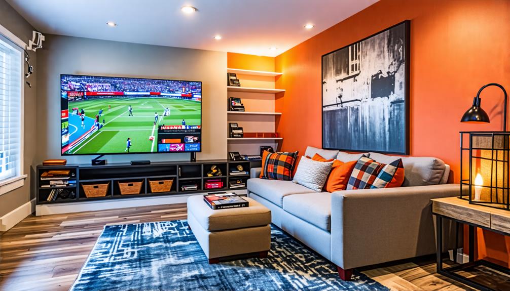 Creating a game room that doubles as a guest room involves striking a balance between comfort and entertainment. Opt for space-saving furniture like a Murphy bed or a stylish futon, and carefully plan your gaming setup. Enhance the atmosphere with versatile lighting and decor that appeal to both gamers and guests. The key to making this dual-purpose room truly inviting lies in the thoughtful details you incorporate, which we'll explore next.